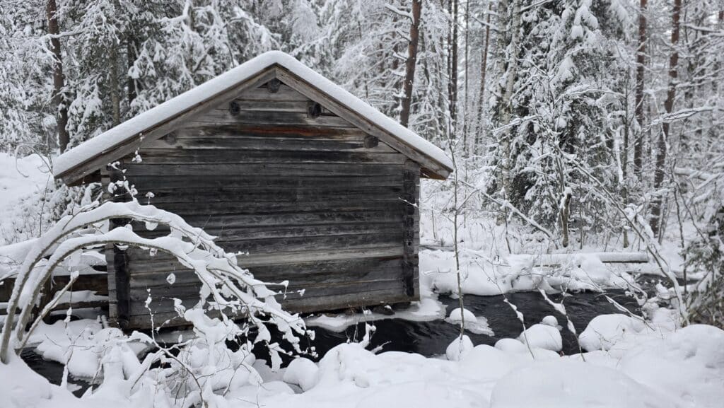 At the old mill, time seems to move at its own pace. The shimmering ice on the river and the light mist above the water create a moment where past and present gently meet. The soft winter daylight and the blueish tones of the ice make the experience at Lounatkoski especially peaceful.
