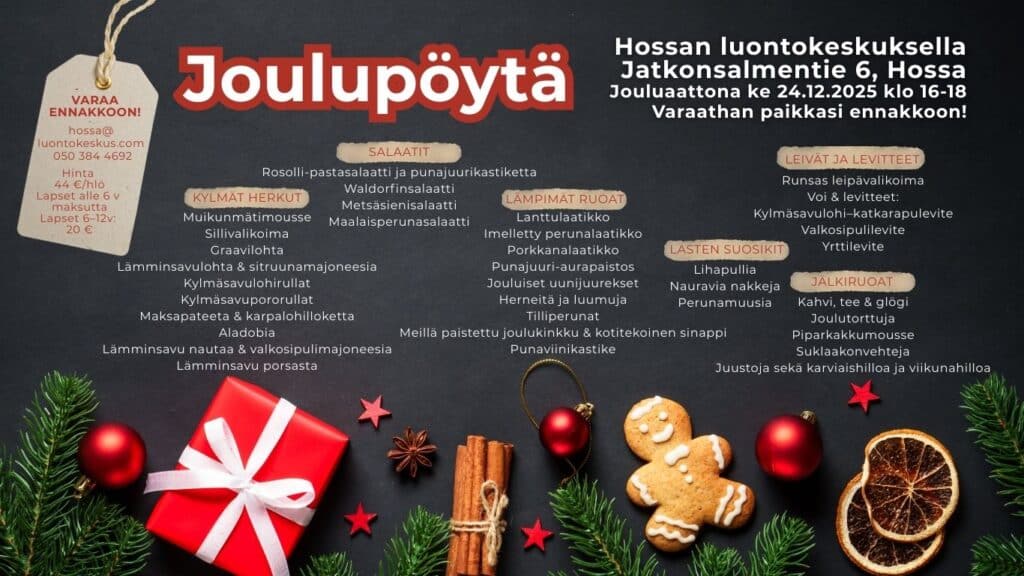 Jouluaaton lämpö ja rauha löytyvät Hossan Luontokeskuksesta, aivan Hossan kansallispuiston kainalosta. Joulupöytä kutsuu klo 16–18 sinut nauttimaan kiireettömästä juhlahetkestä luonnon keskellä.