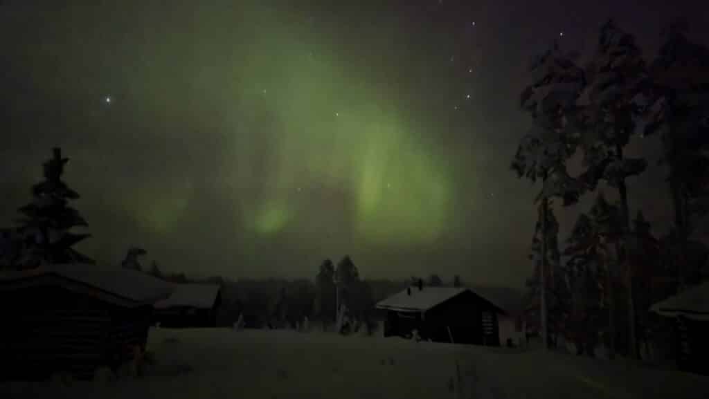 Päivän kääntyessä iltaan maisema hiljenee uudelleen. Pilkkopimeässä pakkasyössä taivaalle syttyvät revontulet. Pimeässä otetut kuvat ovat hieman utuisia, pakkasyön pilvien pehmentämiä – aivan kuten itse hetkikin. Taivaanvalot liikkuvat rauhallisesti, vihertäen ja häviten taas. Niitä on kiva seurata, hetken aikaa vain katse taivaalla, ilman muuta tekemistä.