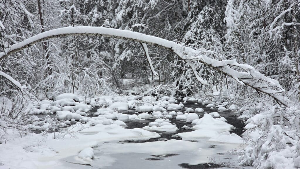 Talvinen Lounatkoski tarjoaa rauhallisen hetken luonnon keskellä. Luminen metsä, hiljaa virtaava koski ja vanha mylly luovat täydellisen paikan pienelle piipahdukselle Hossan ja Kylmäluoman talvimaisemissa.