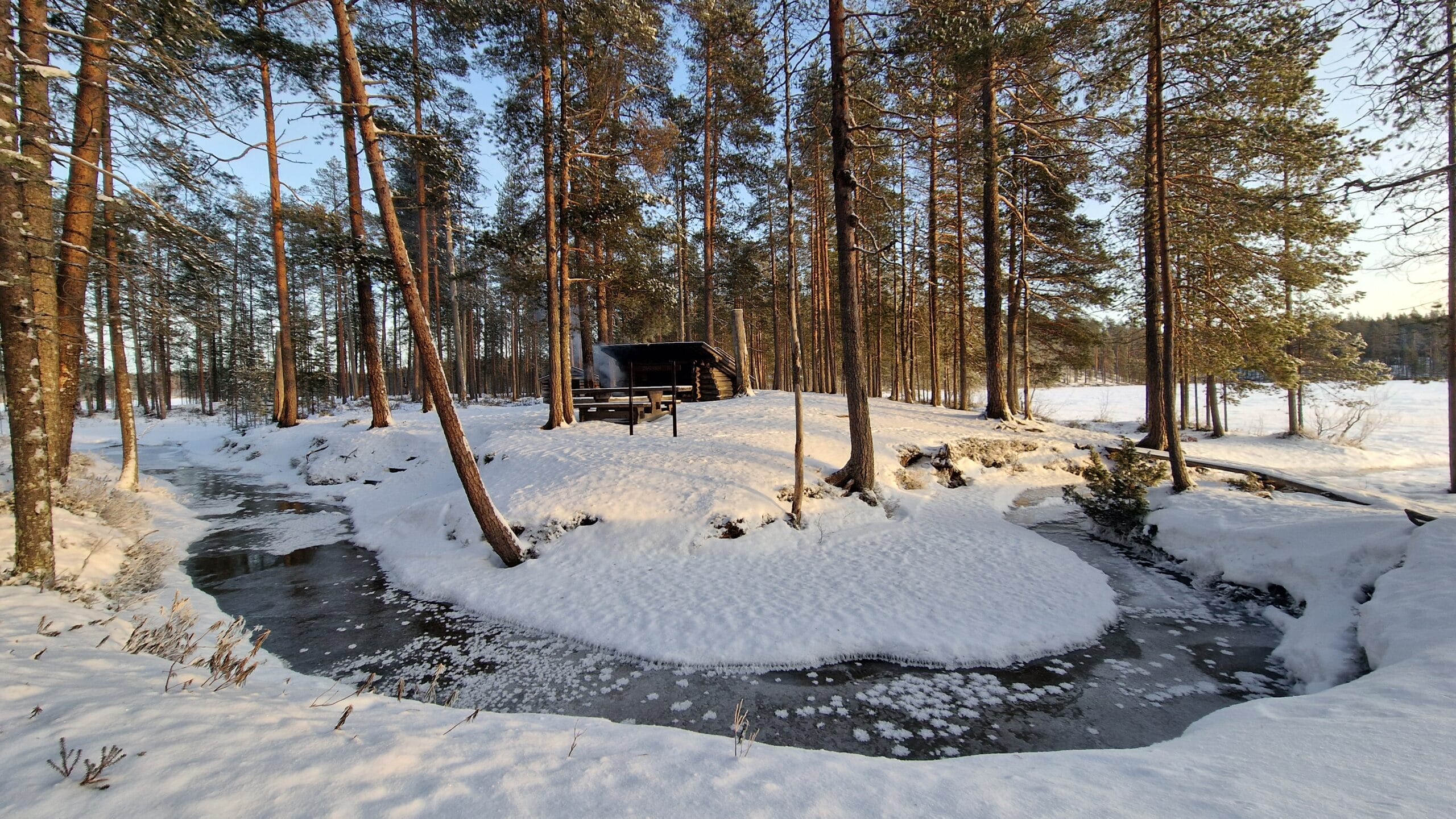Perillä odottavat laavu, nuotiopaikka, wc ja polttopuut. Evästauko nuotion äärellä kirkkaassa kevätsäässä kruunaa retkipäivän. Osittain sulana virtaava puro ja lumiset metsänrannat tekevät maisemasta ainutlaatuisen juuri tähän vuodenaikaan.