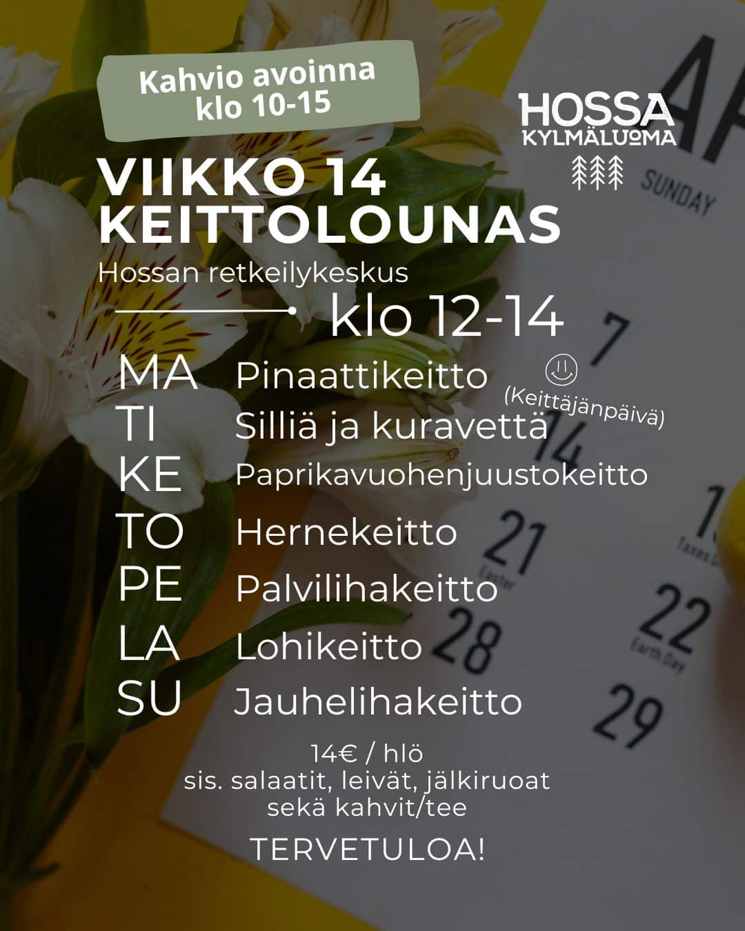 Retkeilykeskuksen lounasbuffet on katettuna päivittäin klo 12.00–16.00. Tarjolla on maittavaa ruokaa, paikallisia makuja ja raikkaita kesäisiä vaihtoehtoja. Tule yksin, kaksin tai koko perheen kanssa – meillä ruoka maistuu!